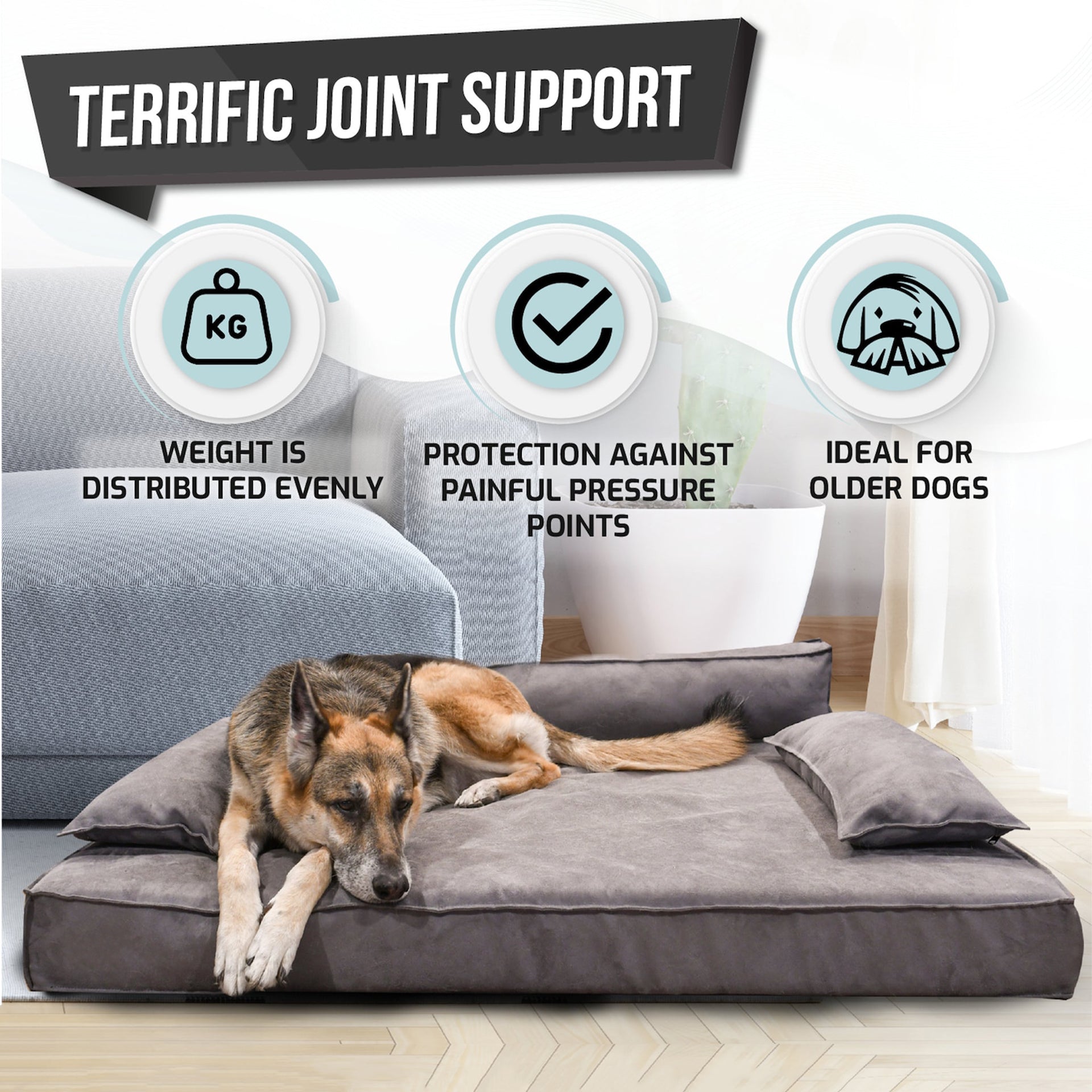 Our classic pet bed sofa is designed to give your fluffy friend plenty of room to stretch out and get cozy in any position they love. The orthopaedic memory foam provides the perfect balance of comfort and support, making it an investment in your pets long-term health and happiness. Upholstered in ultra-soft velour fabric, this bed isnt just a place to restits a calming retreat that helps ease aches, pains, and supports their joints and muscles, so they feel cared for and truly at home. Please note that personalised name print units are non returnable.Available in multiple sizes, please refer to the size guide and choose the one most compatible with your furry friend.WHATS IT MADE OF?Base Foam We use memory foam combined with high density PU foam to give your pet the perfect balance of support and comfort.Cushion Filling Fille